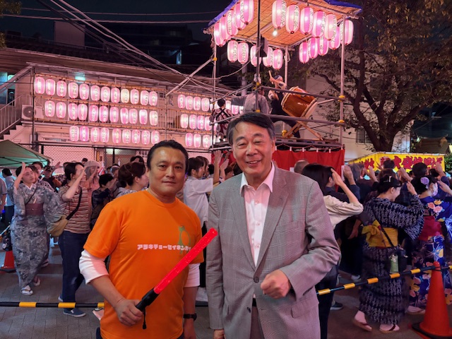 夕方からは、新宿区荒木町にある荒木公園で行われでいる「踊ろう!in荒木町の秋」に顔を出しました。荒木町では昨年から夏の猛暑を避けて、秋になってから「盆踊り」を開催しています。この機会が今年最後の盆踊りということで公園いっぱいの人出となりました。写真は会場の整理係として活躍する志田雄一郎区議会議員と写しました。