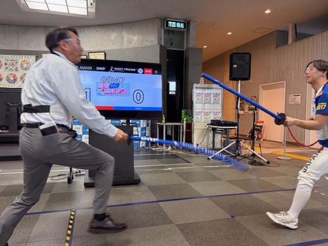 コズミックセンターの会場では、パリオリンピック、フェンシング競技銅メダルの福島史帆実さんが参加してフェンシングの模範演技がありました。かねてからフェンシングには興味があったのでソフトフェンシングの体験試合を大学生相手にやりました。結果は5対1で私の勝ち。昔、剣道で会得した間合いの取り方が勝因でした。