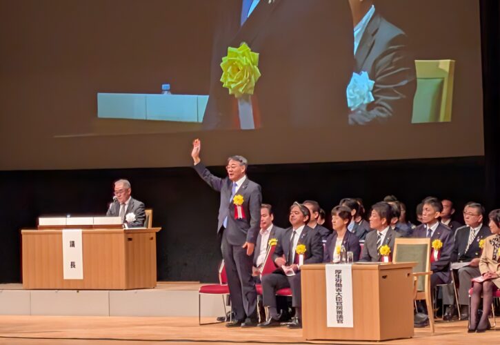 東京国際フォーラムで開かれた健康保険組合連合会全国大会の会場に駆けつけ、国民皆保険制度存続のため尽力されている組合員の皆さんを激励しました。