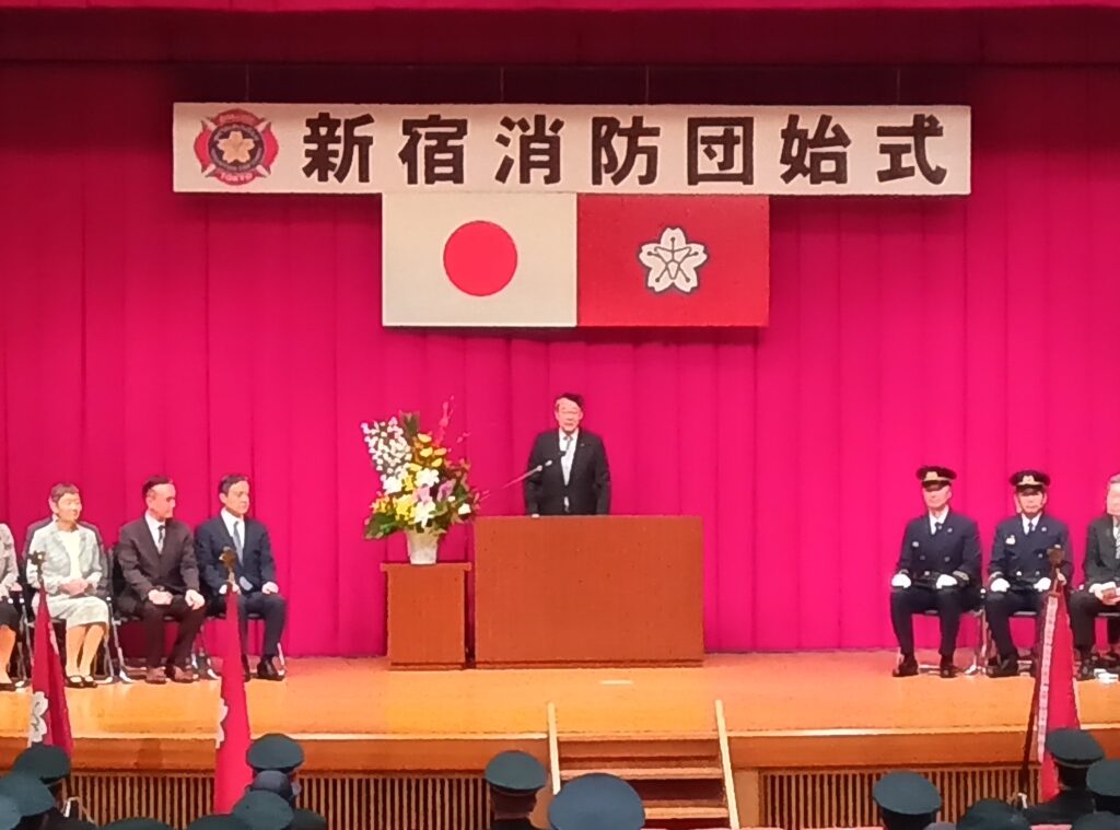 今週末は、各地域の消防団始式が続きます。今日は新宿消防団と神田消防団の始式に出席し、消防団員に激励の挨拶を行いました。