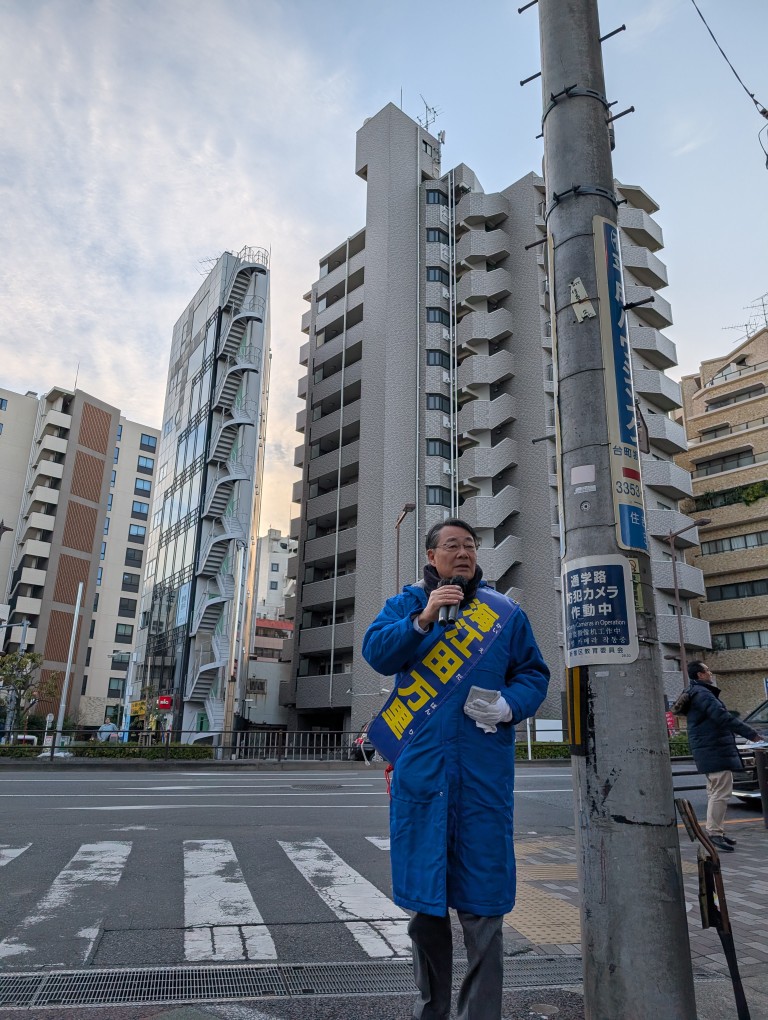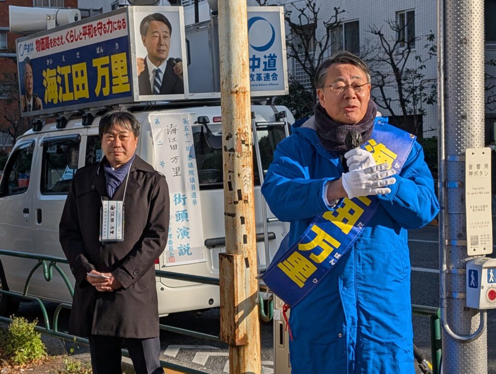 午後から、新宿区、千代田区のスーパー前や商店街で街頭演説を行い、中道改革連合の政策の一つである「食料品の消費税率ゼロ」について訴えました。