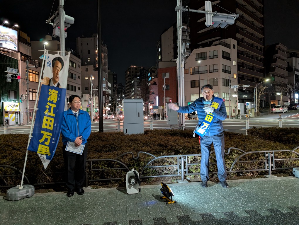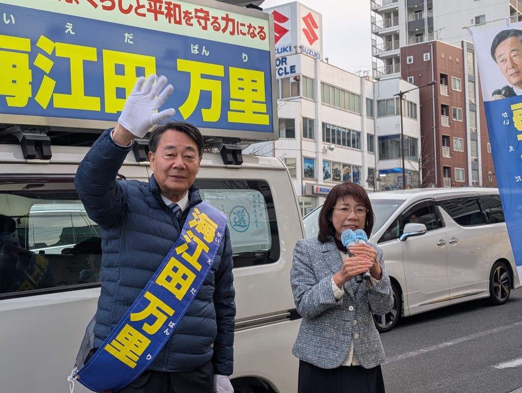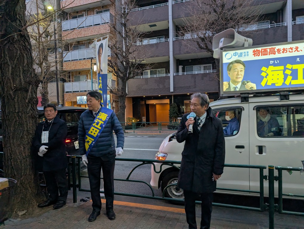 「国の予算を決める一年で一番大切な時期に、争点のないまま衆議院を解散して、国民の生活に影響を与える決断をした高市政権をこのまま存続させるわけにはいかない。皆さんの持っている2票を小選挙区は私、海江田万里に、比例区は中道へ投票して私たちに力を与えてください。」と訴えました。